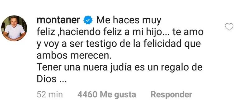 Y remató: "Tener una nuera judía es un regalo de Dios...". Y en la página oficial del dúo Mau y Ricky, le dedicó un mensaje de amor a su hijo en su nueva vida: "Una hermosura... qué felices son y van a ser. Te amo miijo, te ganaste una hermosa argentina. Nacida donde yo nací. Te amo".