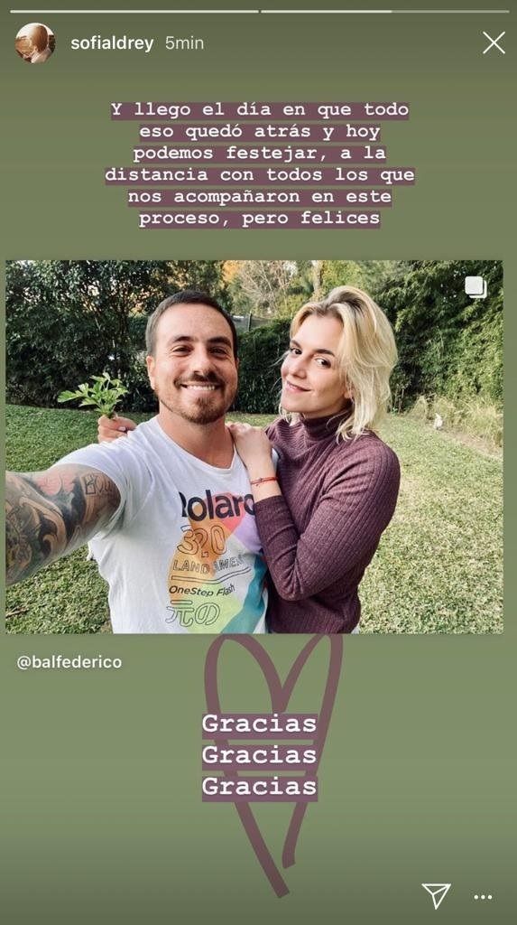 Su novia, Sofía Aldrey, le dedicó también un tierno posteo: "Y llegó el día en que todo eso quedó atrás. Hoy podemos festejar a la distancia con todos los que nos acompañaron en este proceso. Felices. Gracias, gracias gracias", expresó la rubia.