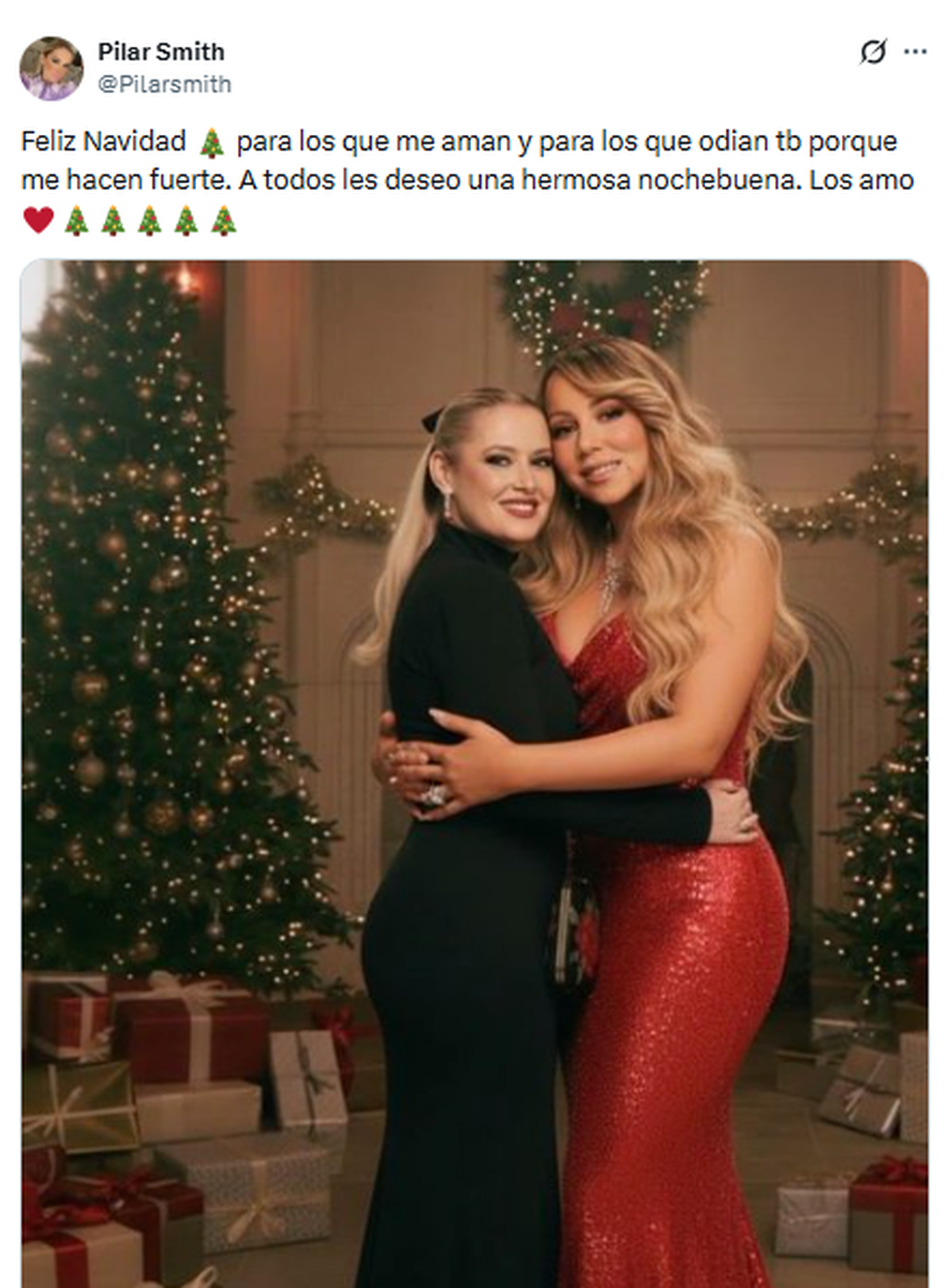 Pilar Smith, de una semana muy intensa por la expulsión de APTRA, también deseó el bienestar: "Feliz Navidad para los que me aman y para los que odian también porque me hacen fuerte. A todos les deseo una hermosa nochebuena. Los amo".