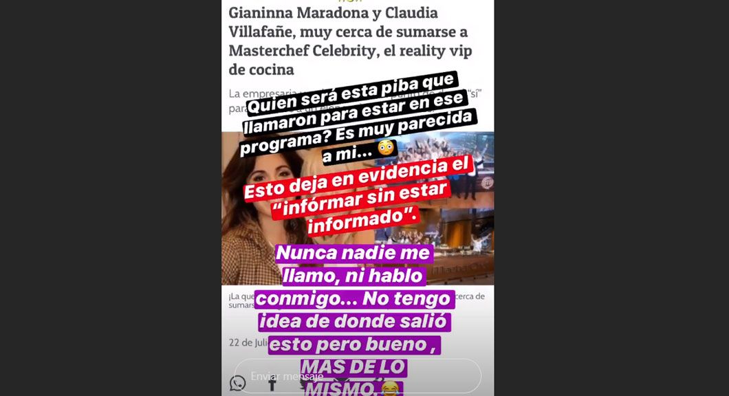 Además, en la nómina estaban Claudia Villafañe junto a Gianinna Maradona. Sin embargo, la hija de Maradona confirmó desde las redes que no fue convocada y que no participará, ya que -al parecer- la cocina no es el lugar en el que más cómoda se siente.