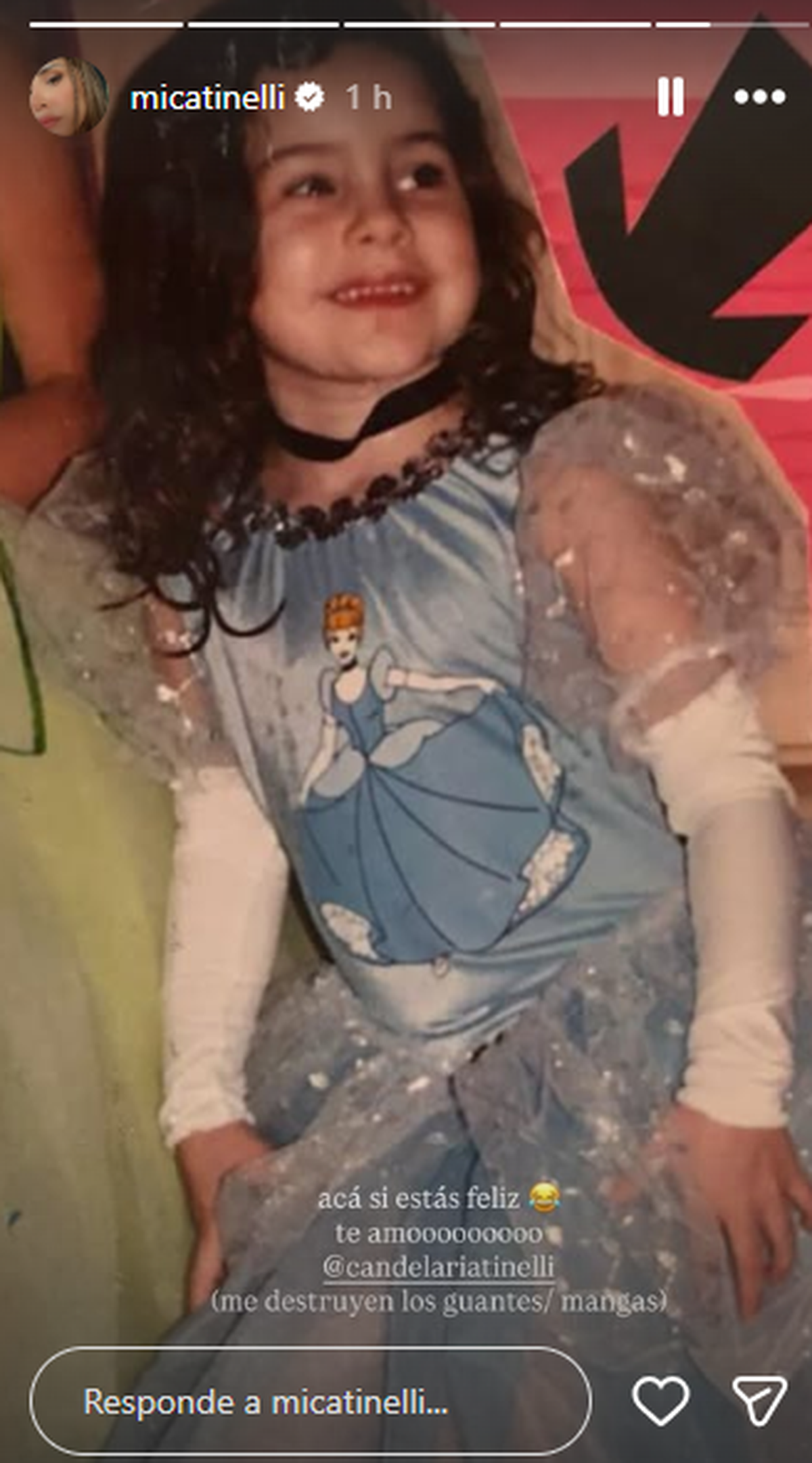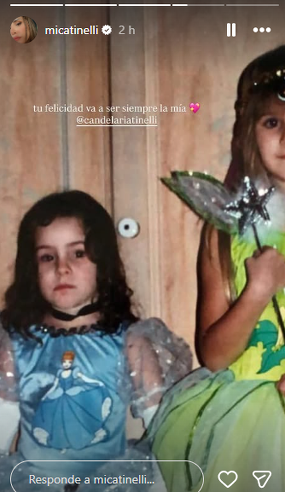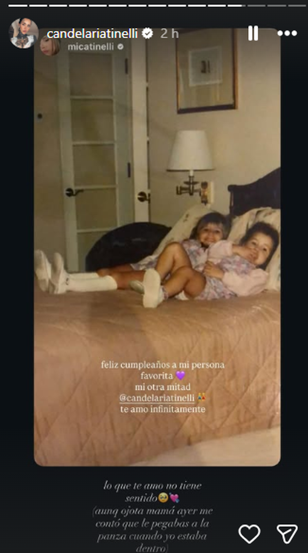 "Feliz cumpleaños a mi persona favorita. Mi otra mitad, Candelaria Tinelli. Te amo infinitamente", escribió Mica en su cuenta de Instagram, y subió una imagen de ambas, pequeñas, sobre la cama de sus padres. "Tu felicidad va a ser siempre la mía", agregó la hija mayor, con otra foto de su infancia.