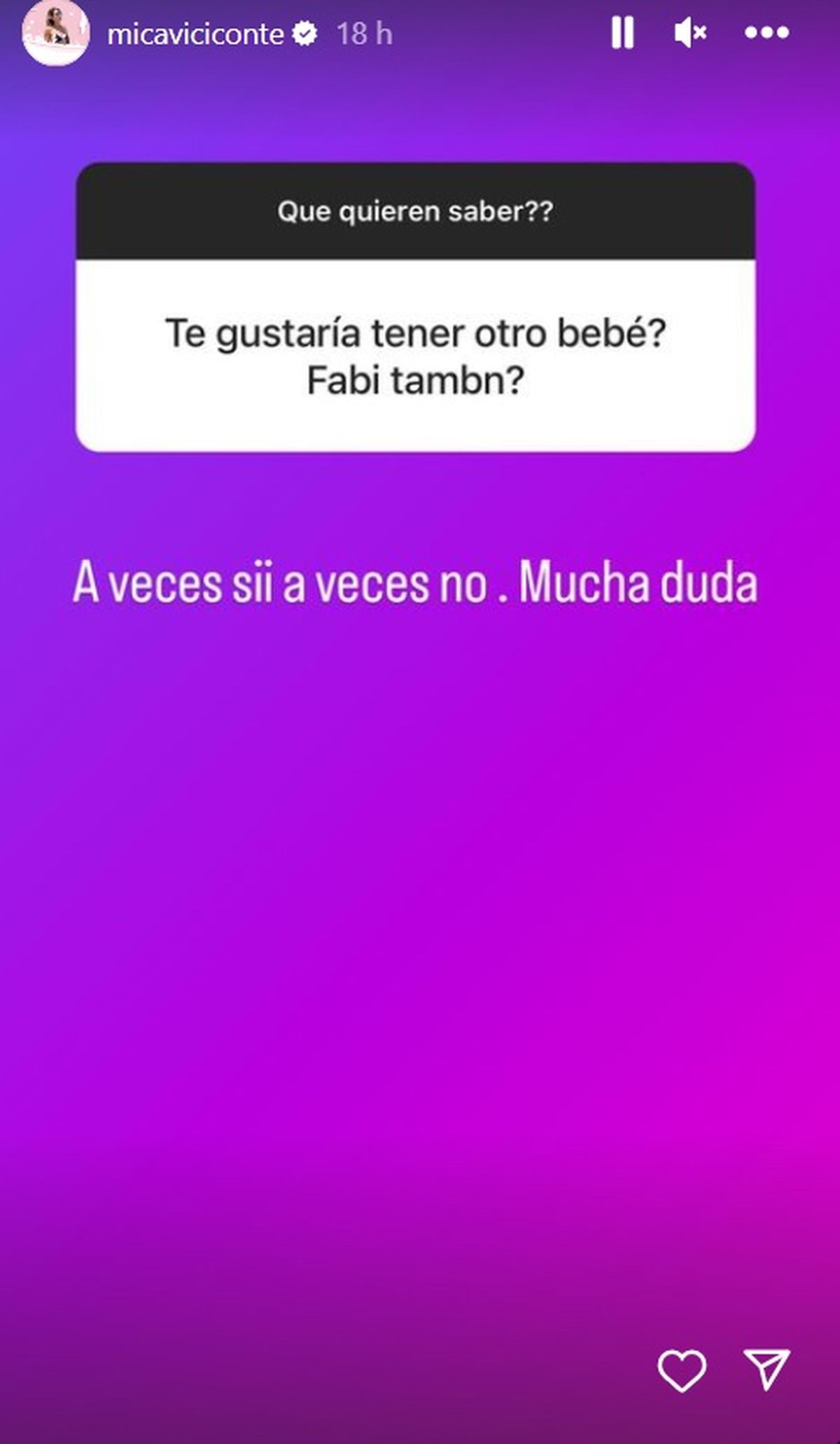 "¿Te gustaría tener otro bebé? ¿Fabi también?", le preguntaron a Mica Viciconte. Y ella respondió sincera: "A veces sí, a veces no. Mucha duda".