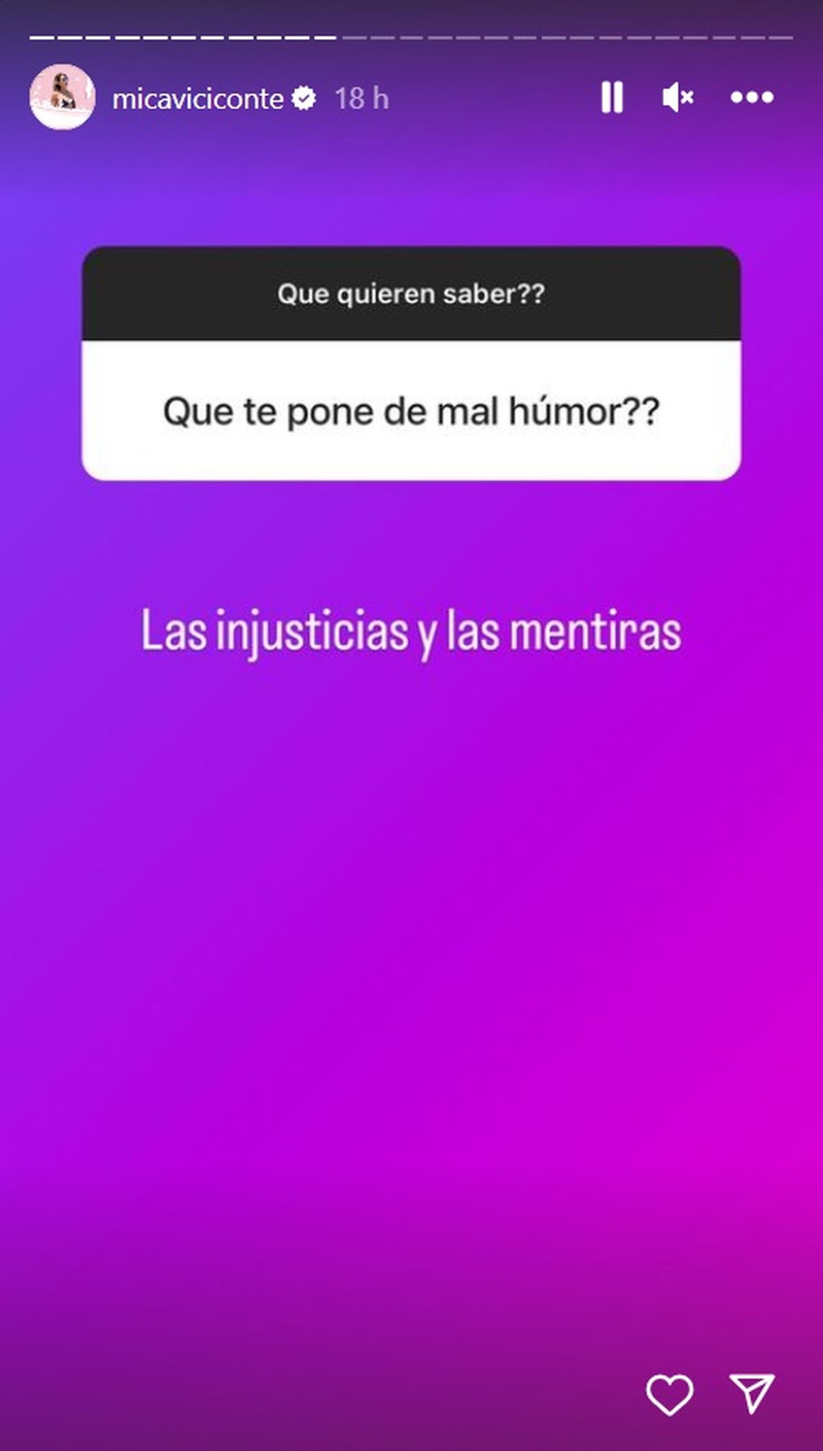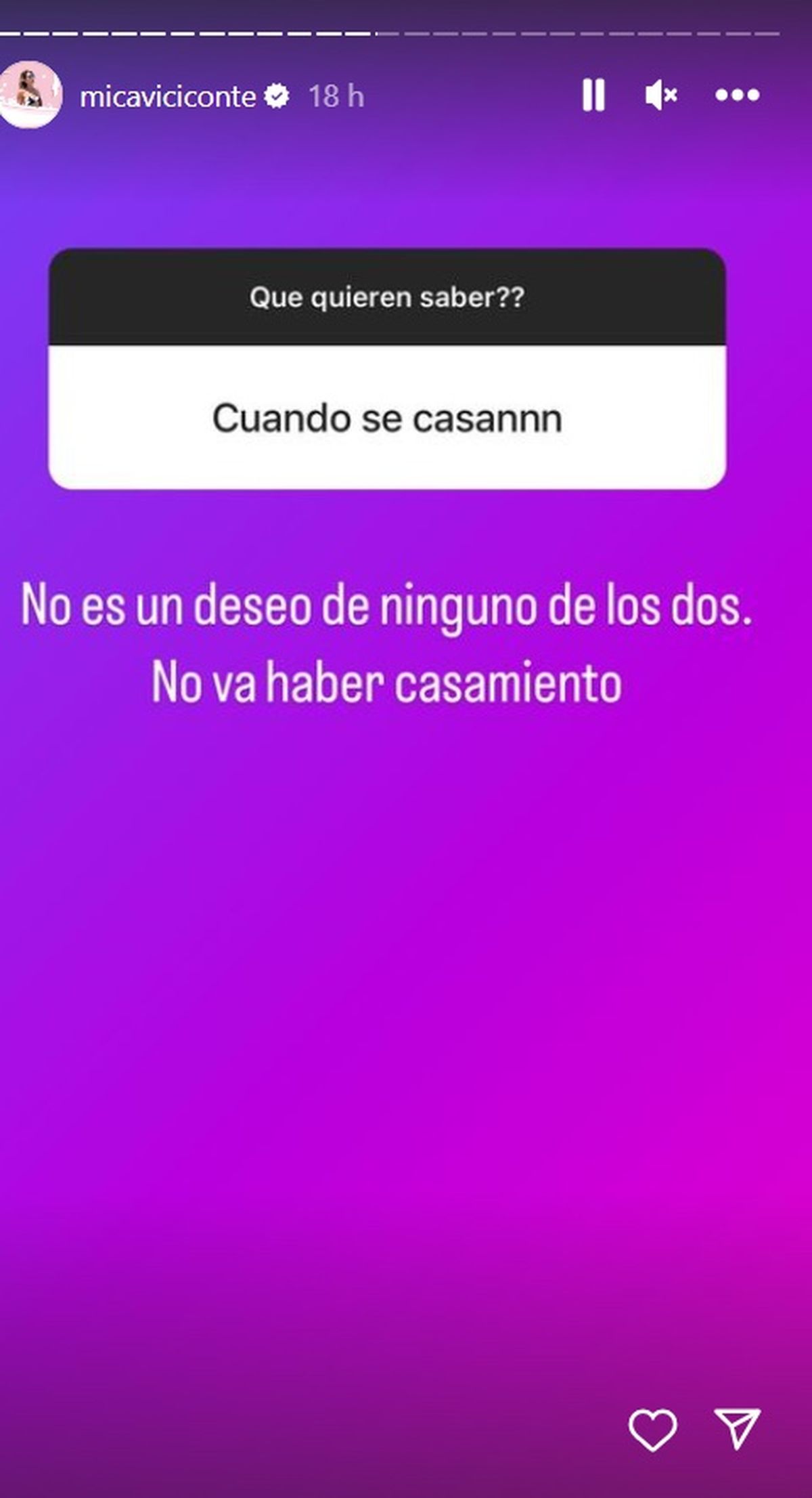 En tanto, Mica Viciconte reveló también si habrá boda o no con el ex futbolista. "Cuando se casan", quiso saber uno de sus fans virtuales. Y ella fue categórica: "No es un deseo de ninguno de los dos. No va a haber casamiento".