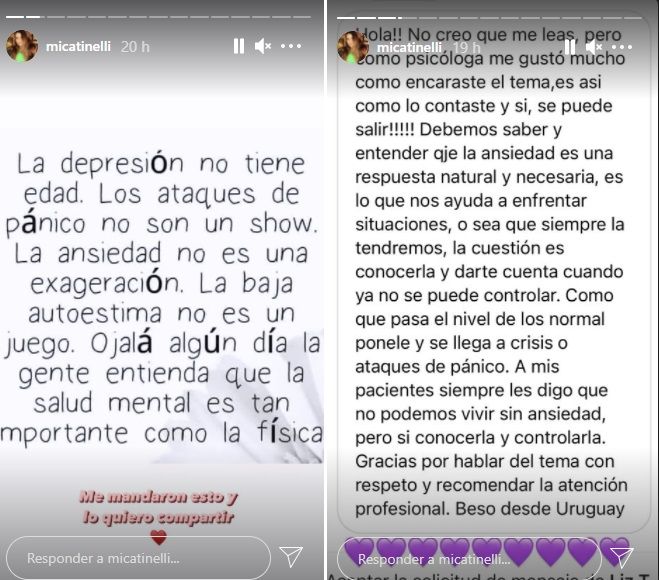 Luego, Mica compartió algunos mensajes de sus seguidores que le llegaron por privado, donde se sentían identificados con su valiente relato en primera persona.