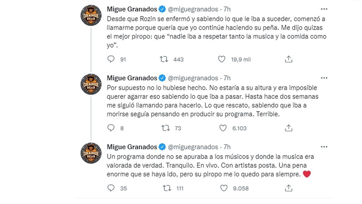 "Desde que Rozín se enfermó y sabiendo lo que le iba a suceder, comenzó a llamarme porque quería que yo continúe haciendo su peña. Me dijo quizás el mejor piropo: que “nadie iba a respetar tanto la música y la comida como yo”", comentó Migue Granados en Twitter.