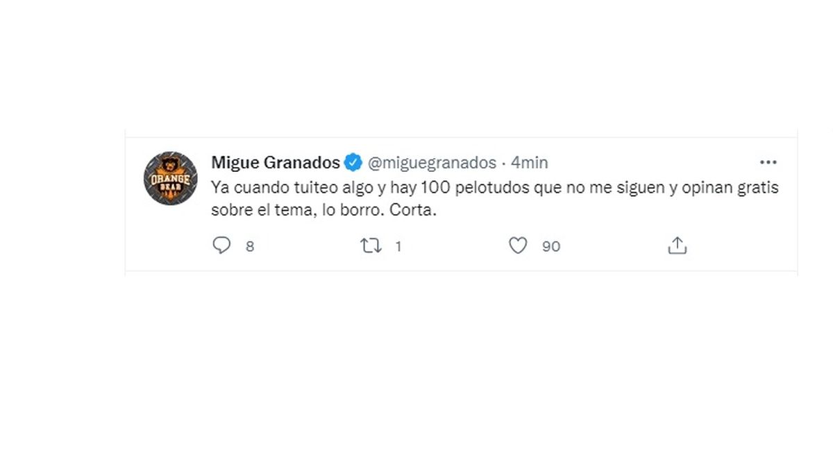 Migue luego borró los mensajes y explicó la razón: "Ya cuando tuiteo algo y hay 100 pelotudos que no me siguen y opinan gratis sobre el tema, lo borro. Corta".