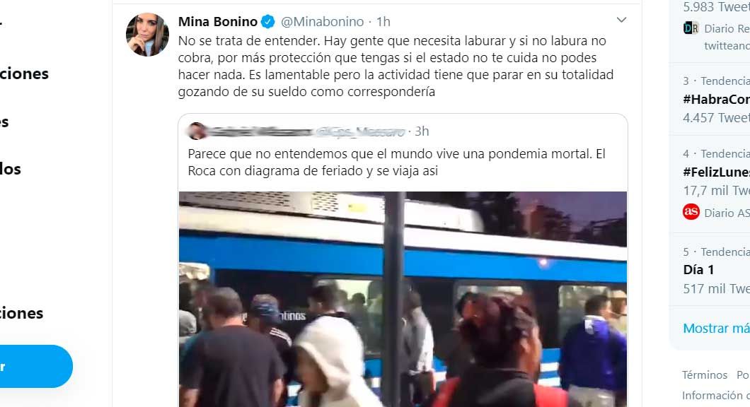 Y, ante un video de esta mañana de un tren lleno de pasajeros, se alarmó: “No se trata de entender. Hay gente que necesita laburar y si no labura no cobra, por más protección que tengas si el estado no te cuida no podes hacer nada. Es lamentable pero la actividad tiene que parar en su totalidad gozando de su sueldo como correspondería”.