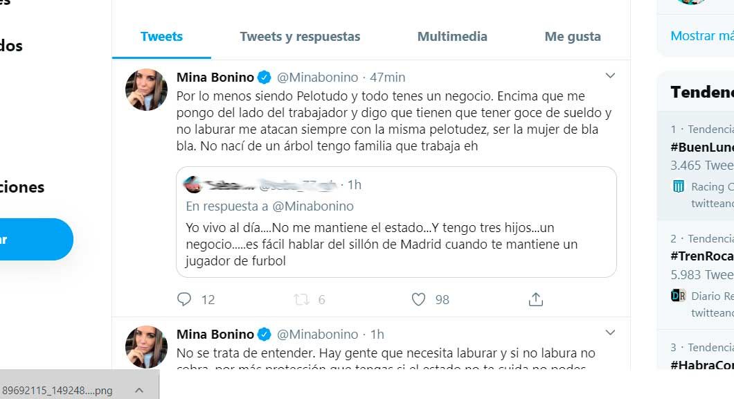 Un seguidor le replicó sobre su realidad ante el planteo de la morocha: “Yo vivo al día....No me mantiene el Estado...Y tengo tres hijos...un negocio.....es fácil hablar del sillón de Madrid cuando te mantiene un jugador de fútbol”. Entonces, Mina se enojó: “Por lo menos siendo pelo... y todo tenes un negocio. Encima que me pongo del lado del trabajador y digo que tienen que tener goce de sueldo y no laburar me atacan siempre con la misma pelotudez, ser la mujer de bla bla. No nací de un árbol tengo familia que trabaja eh”.