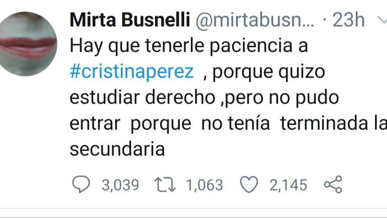 Hay que tenerle paciencia a #cristinaperez, porque quizo estudiar derecho, pero no pudo entrar porque no tenía terminada la secundaria”, escribió Mirtha.