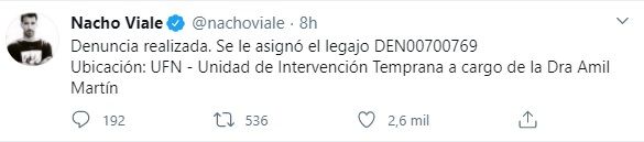 "Denuncia realizada. Se le asignó el legajo DEN00700769 Ubicación: UFN - Unidad de Intervención Temprana a cargo de la Dra Amil Martín", indicó el productor con los datos de la presentación realizada en la Justicia.