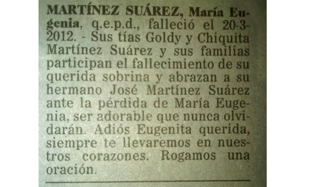 Así lo expresa el aviso fúnebre publicado hoy en el diario La Nación: “sus tías Goldy y Chiquita Martínez Suárez y sus familias participan el fallecimiento de su querida sobrina y abrazan a su hermano José Martínez Suárez ante la pérdida de María Eugenia, ser adorable que nunca olvidarán. Adiós Eugenita querida, siempre te llevaremos en nuestros corazones. Rogamos una oración”.