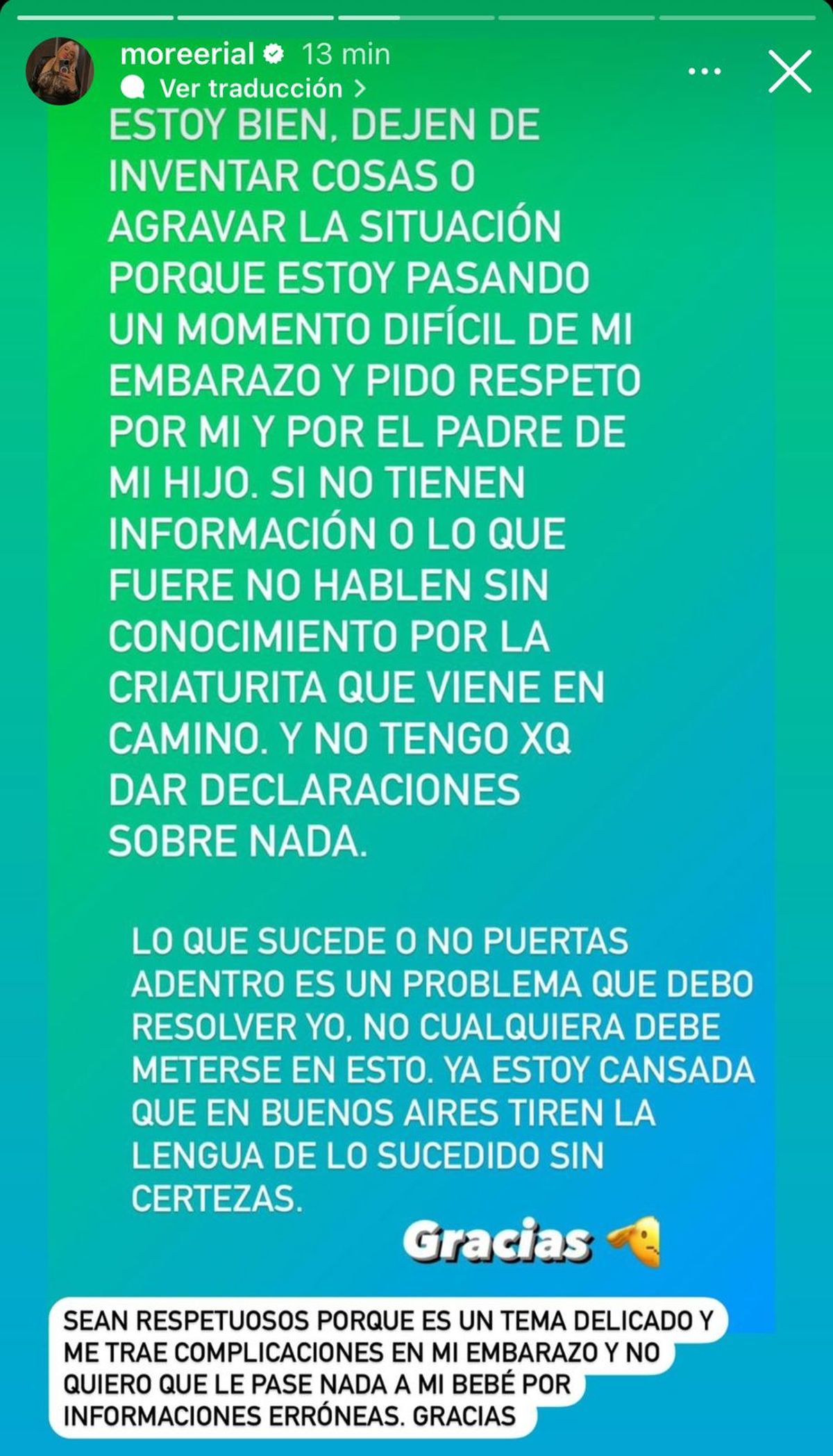 "Sean respetuosos porque es un tema delicado, me trae complicaciones en mi embarazo y no quiero que le pase nada a mi bebé por informaciones erróneas. Gracias", finalizó.