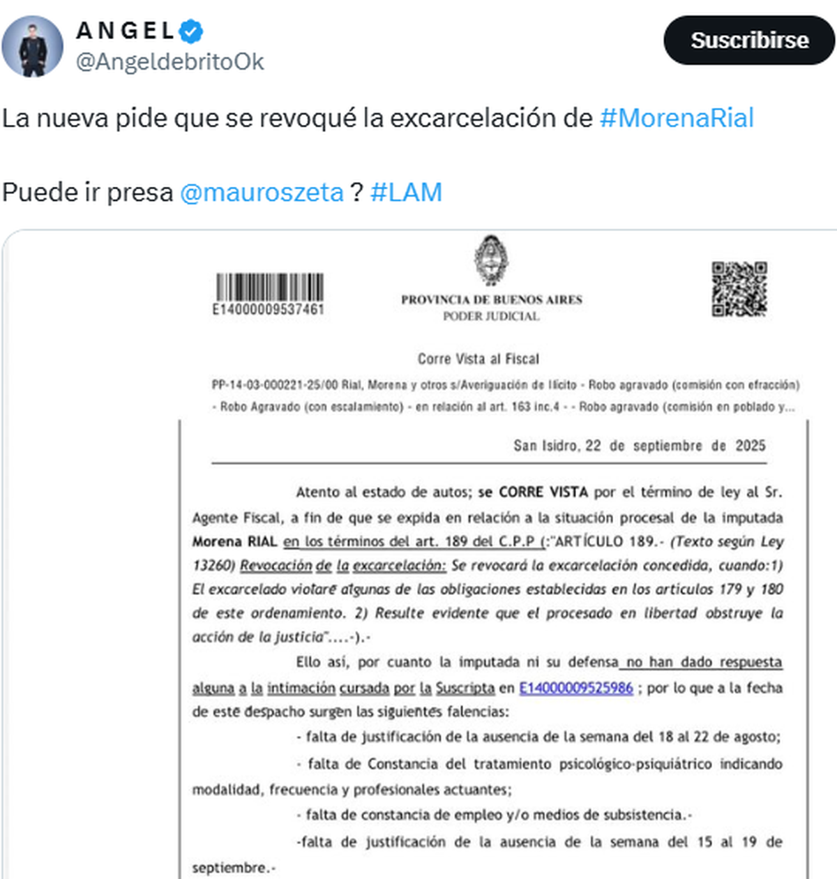 Ángel de Brito, a través de su cuenta de X, publicó la imagen de un documento en el que la fiscalía solicita la revocación de la excarcelación, al considerar que la imputada no cumplió con los requisitos establecidos.