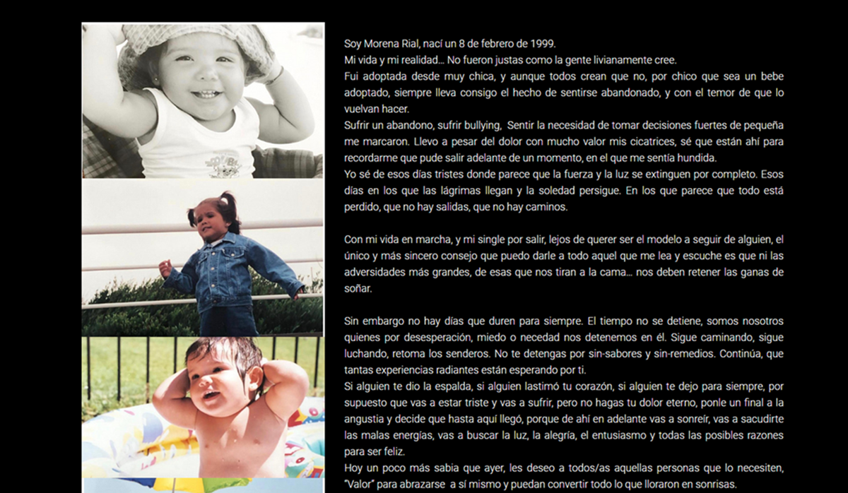"Mi vida y mi realidad no fueron justas como la gente cree. Fui adoptada desde muy chica y aunque todos crean que no, por chico que sea un bebe adoptado, siempre lleva consigo el hecho de sentirse abandonado y con el temor de que lo vuelvan hacer", contó.