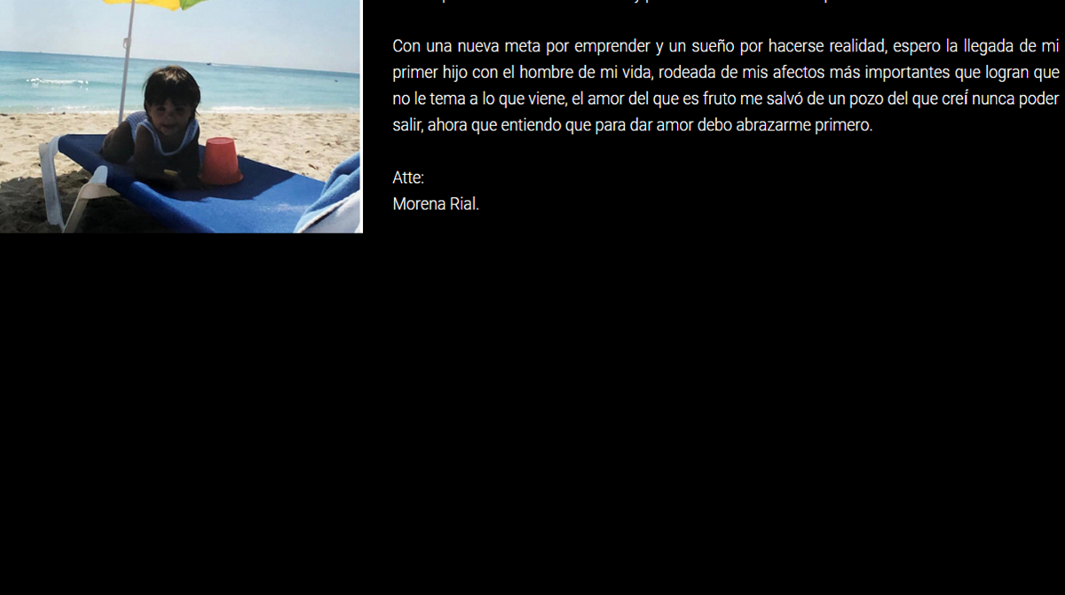 Y siguió : "Sufrir abandono, bullying y sentir la necesidad de tomar fuertes decisiones de chica, me marcaron. Pese al dolor, llevo con valor mis cicatrices porque sé que están ahí para recordarme que pude salir adelante en un momento en el que estaba hundida. Con una nueva meta por emprender y un sueño por hacerse realidad, espero la llegada de mi primer hijo con el hombre de mi vida, rodeada de mis afectos más importantes que logran que no le tema a lo que viene. El amor del que es fruto me salvó de un pozo del que creí́ no salir nunca. Ahora entiendo que para dar amor tengo que abrazarme primero".