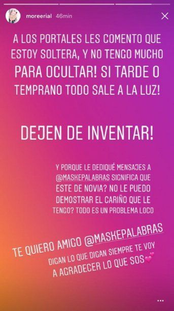 Sucede que al día siguiente de haber anunciado, vía Instagram, el final de su noviazgo con el futbolista Facundo Ambrosioni, la hija de Jorge expresó, en la misma red social, su gran afecto por un muchacho de 30 años cuyo nombre es Yamil Bohamia y su nick @maskepalabras.