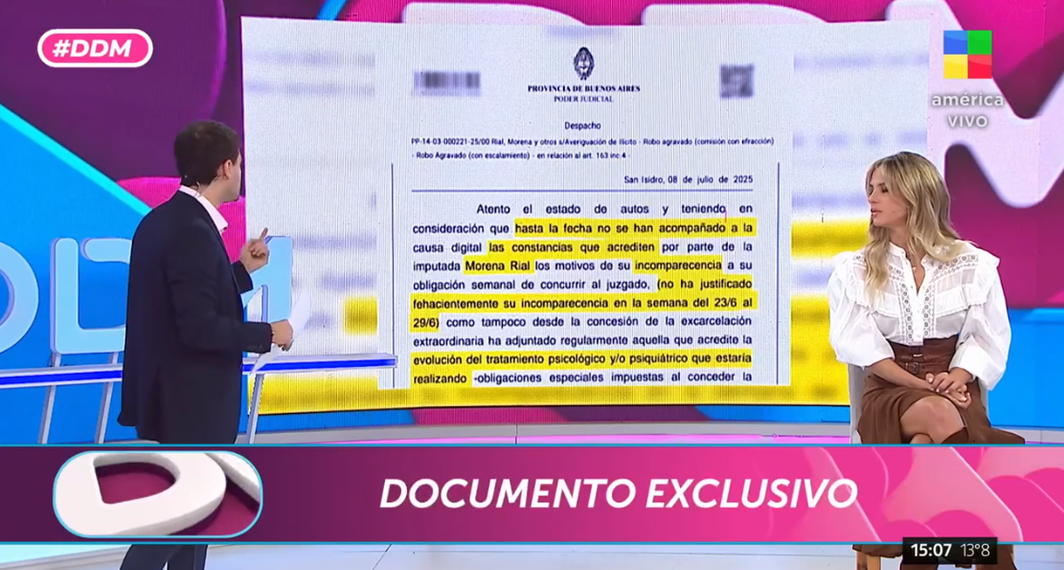 El documento del Tribunal de San Isidro finaliza: "Hasta la fecha no se han incorporado al expediente digital las constancias que acrediten, por parte de Morena Rial, los motivos de su incomparecencia durante la semana del 23 al 29 de junio, ni tampoco se ha adjuntado regularmente, desde la concesión de la excarcelación extraordinaria, la documentación que acredite la evolución del tratamiento psicológico que estaría realizando. Corráse traslado al Sr. Agente Fiscal para que se expida sobre la situación procesal de la encartada".