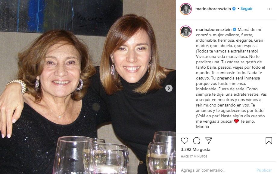 Su hija Marina la despidió con dolor desde Instagram: "Mamá de mi corazón, mujer valiente, fuerte, indomable, hermosa, elegante. Gran madre, gran abuela, gran esposa. ¡Todos te vamos a extrañar tanto! Viviste una vida maravillosa. No te perdiste una. Tu cadera se gastó de tanto baile, paseos, viajes por todo el mundo. Te caminaste todo. Nada te detuvo. Tu presencia será inmensa porque vos fuiste inmensa. Inolvidable. Fuera de serie. Como siempre te dije, una extraterrestre. Vas a seguir en nosotros y nos vamos a reír mucho pensando en vos. Te amamos y te agradecemos por todo. ¡Volá en paz! Hasta algún día cuando me vengas a buscar. Te amo. Marina".