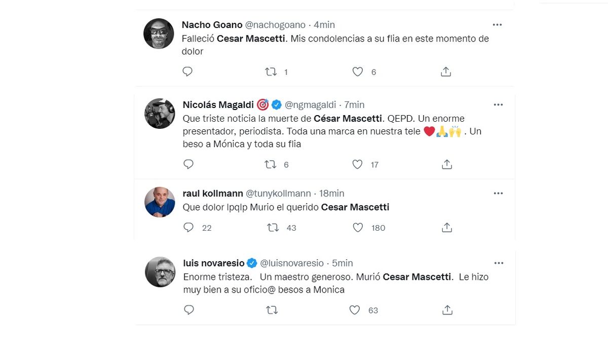 "Que dolor lpqlp Murió el querido Cesar Mascetti", se lamentó Kollmann. "Falleció Cesar Mascetti. Mis condolencias a su flia en este momento de dolor", manifestó Goano.