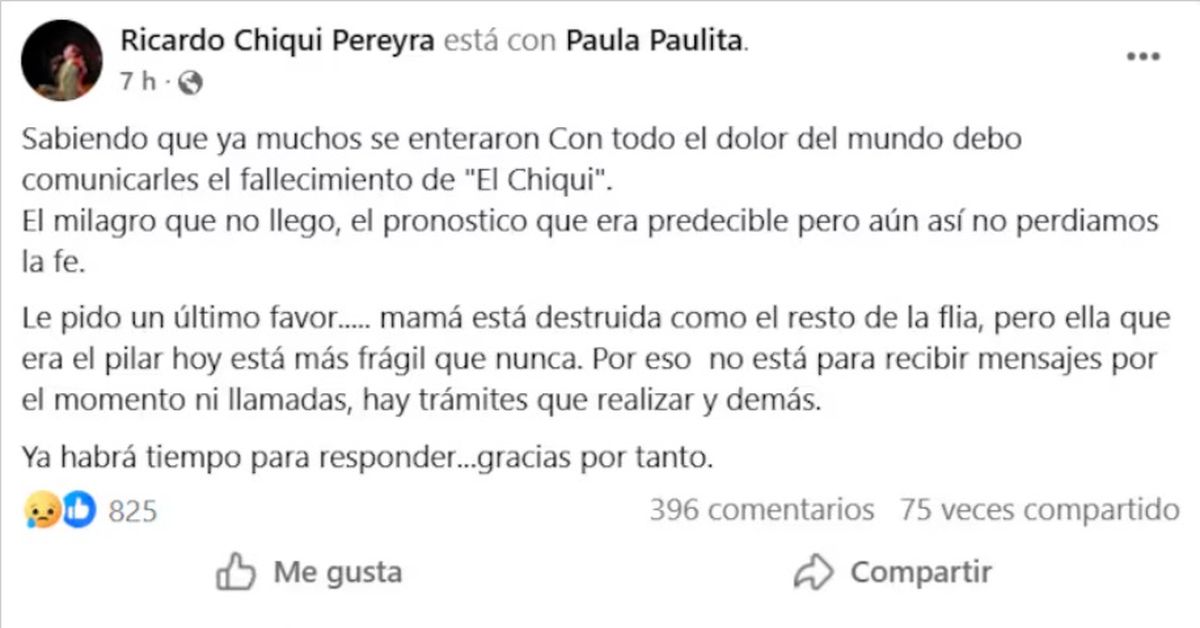 “Sabiendo que ya muchos se enteraron, con todo el dolor del mundo debo comunicarles el fallecimiento de ‘el Chiqui’. El milagro que no llegó, el pronóstico que era predecible, pero aún así no perdíamos la fe", describieron desde su cuenta oficial de Facebook.