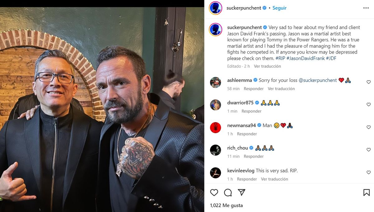 “Muy triste de escuchar del fallecimiento de mi amigo y cliente Jason David Frank. Jason era un artista marcial mejor conocido por interpretar a Tommy en “Power Rangers”. Era un verdadero artista marcial y tuve el placer de ser su mánager para las peleas donde compitió. Si alguien que conozcas está deprimido, por favor contáctalo”, indicó el representante.