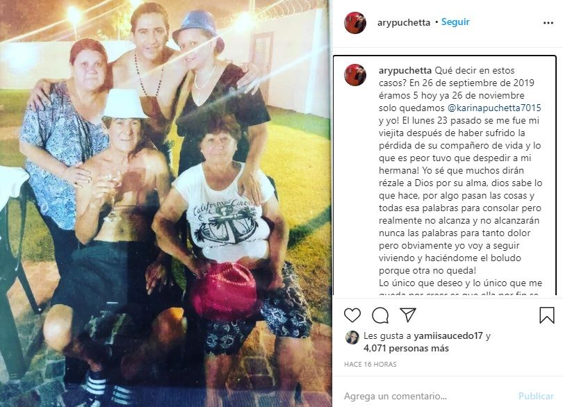 "Yo sé que muchos dirán rézale a Dios por su alma, dios sabe lo que hace, por algo pasan las cosas y todas esa palabras para consolar pero realmente no alcanza y no alcanzarán nunca las palabras para tanto dolor pero obviamente yo voy a seguir viviendo y haciéndome el boludo porque otra no queda!", explicó sentido Ariel.