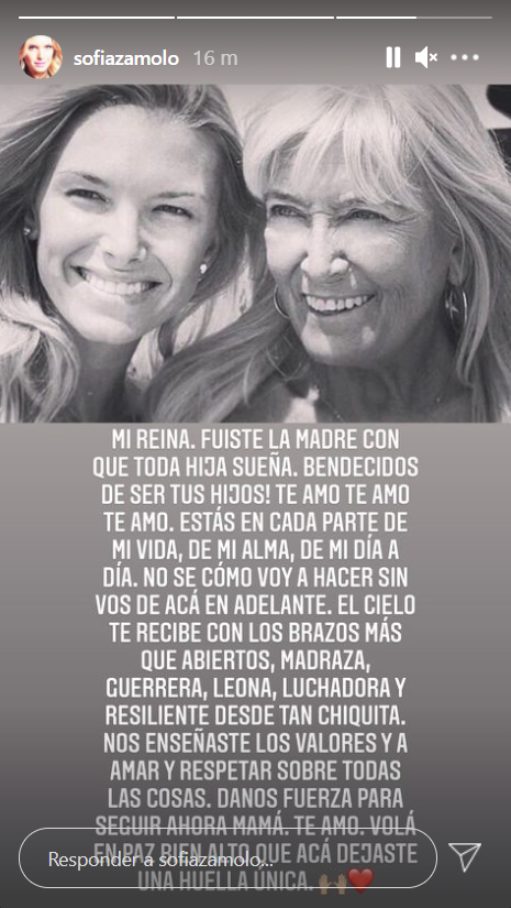"Estás en cada parte de mi vida, de mi alma, de mi día a día. No sé cómo voy a hacer sin vos de acá en adelante. El cielo te recibe con los brazos más que abiertos, madraza, guerrera, leona, luchadora y resiliente desde tan chiquita", añadió Zámolo.
