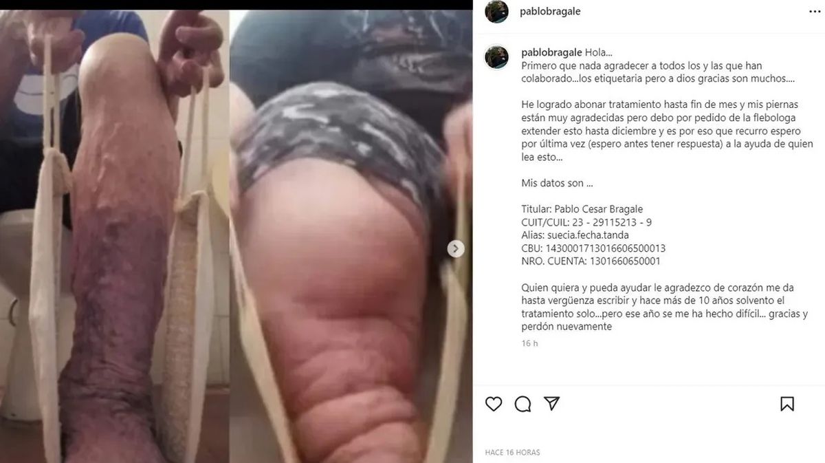 La respuesta de obra social es que la operación que necesita es estética, pero el joven asegura que no. “He logrado abonar el tratamiento hasta fin de mes y mis piernas están muy agradecidas, pero debo -por pedido de la flebóloga- extenderlo esto hasta diciembre y es por eso que pido ayuda a quien lea esto. Hace más de 10 años solvento el tratamiento solo, pero este año se me ha hecho difícil. Gracias y perdón”, escribió en su instagram.