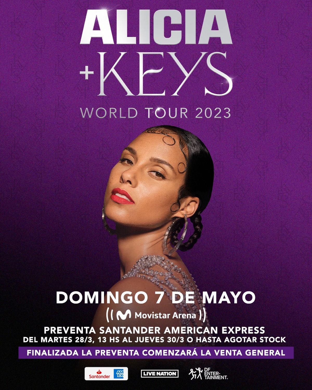 Luego del éxito rotundo de su gira mundial Alicia + Keys World Tour tanto por Europa como por los Estados Unidos en 2022, Alicia Keys anuncia finalmente la etapa latinoamericana de su gira mundial, que incluirá paradas en Brasil, Argentina, Chile y México. La multipremiada artista dará un show en Buenos Aires el domingo 7 de mayo en el Estadio Movistar Arena, producido por Live Nation y DF Entertainment, con escenografía, iluminación y vestuario inspirados en su amigo y mentor Prince. La preventa exclusiva para clientes de un banco comenzará el martes 28 de marzo a las 13 hs, por 48 horas o hasta agotar stock, mientras que la venta general se habilitará a partir del jueves 30 de marzo a la misma hora. En ambos casos, las entradas se conseguirán únicamente por EntradaUno.