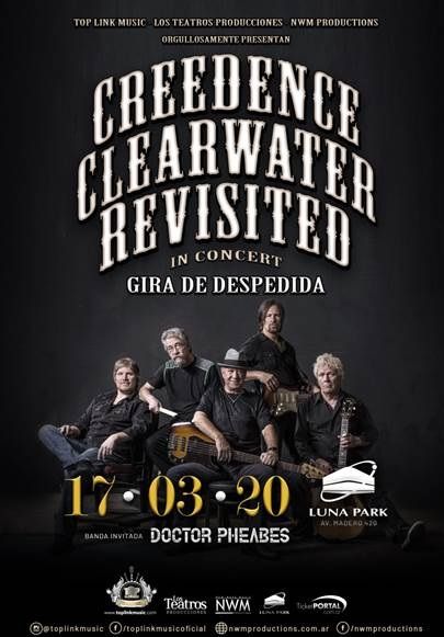 "Creedence Clearwater Revisited" se presenta por última vez en la Argentina en el marco de su gira despedida el martes 17 de marzo de 2020 a las 19 horas en el Estadio Luna Park de Avenida Madero 420. Banda invitada: Doctor Pheabes.