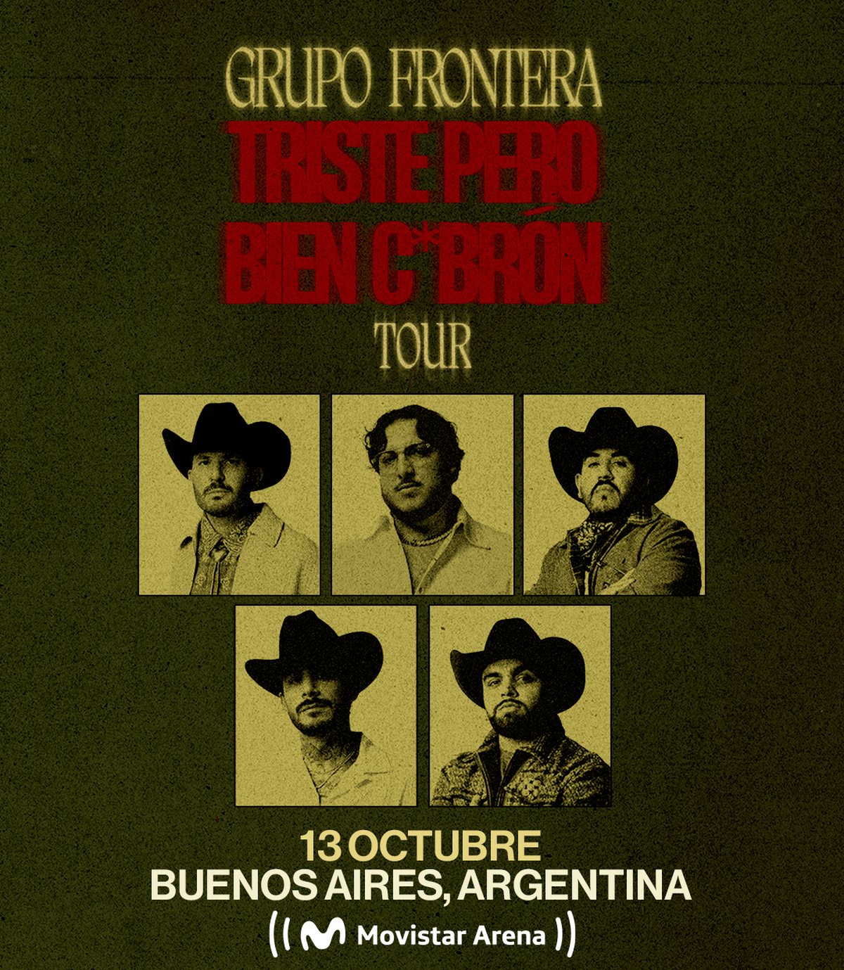 La banda que redefinió los límites del regional mexicano anuncia su primer show en el Movistar Arena de Buenos Aires. Grupo Frontera confirma su regreso a Argentina para el próximo 13 de octubre de 2026 , en una noche imperdible. La cita llega de la mano de DF Entertainment y será la tercera visita del conjunto al país, esta vez en medio de su mejor momento tras el lanzamiento del disco "LO QUE ME FALTA POR LLORAR”. Las entradas estarán disponibles desde el lunes 2 de diciembre a las 10 a.m., exclusivamente a través de movistararena.com.ar, con cualquier medio de pago.