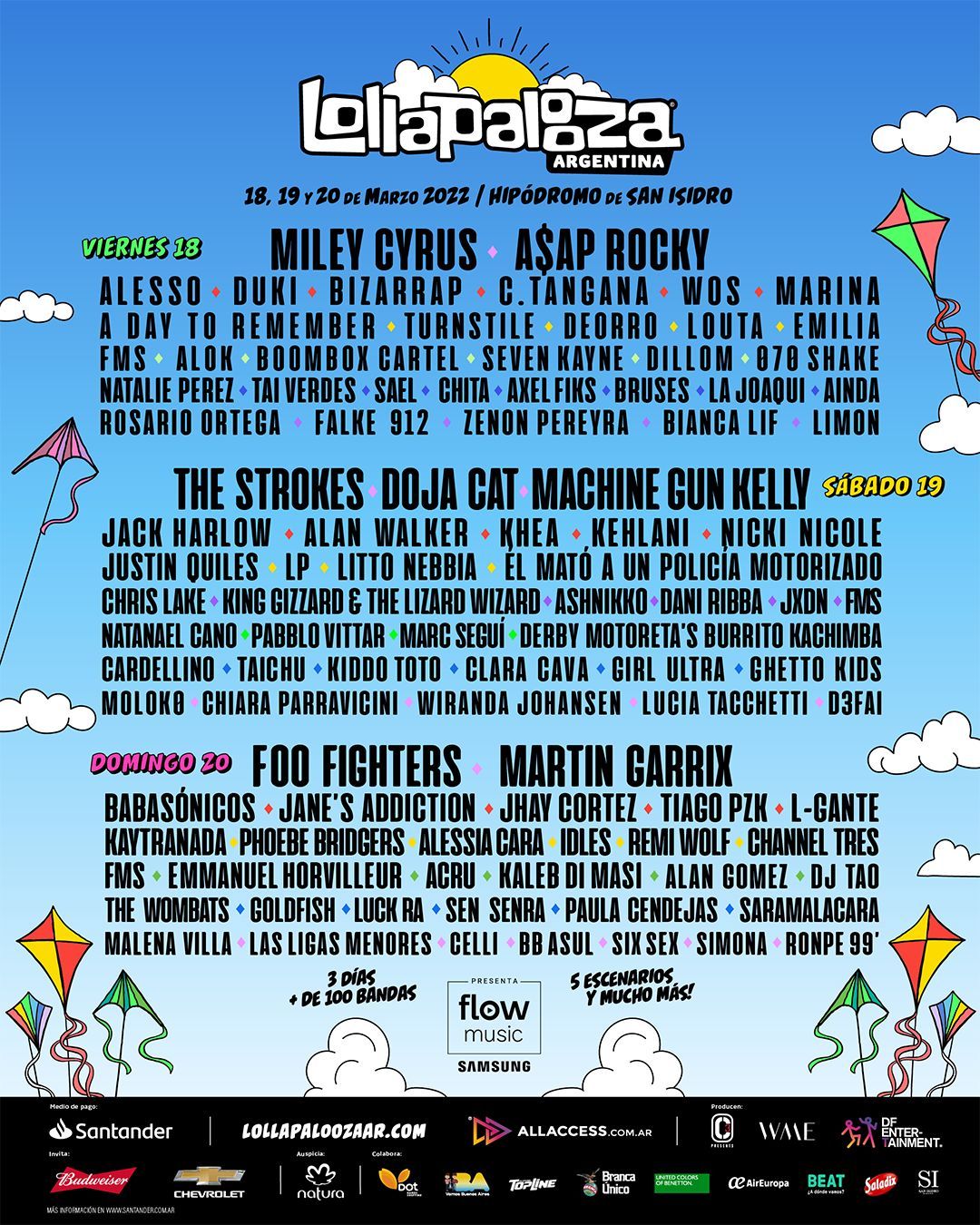 Foo Fighters, The Strokes, Miley Cyrus, Doja Cat, A$AP Rocky y Martin Garrix serán algunos de los artistas que revivirán la magia de Lollapalooza y liderarán el Line Up que se distribuirá por los cinco escenarios del festival más importante de Argentina.