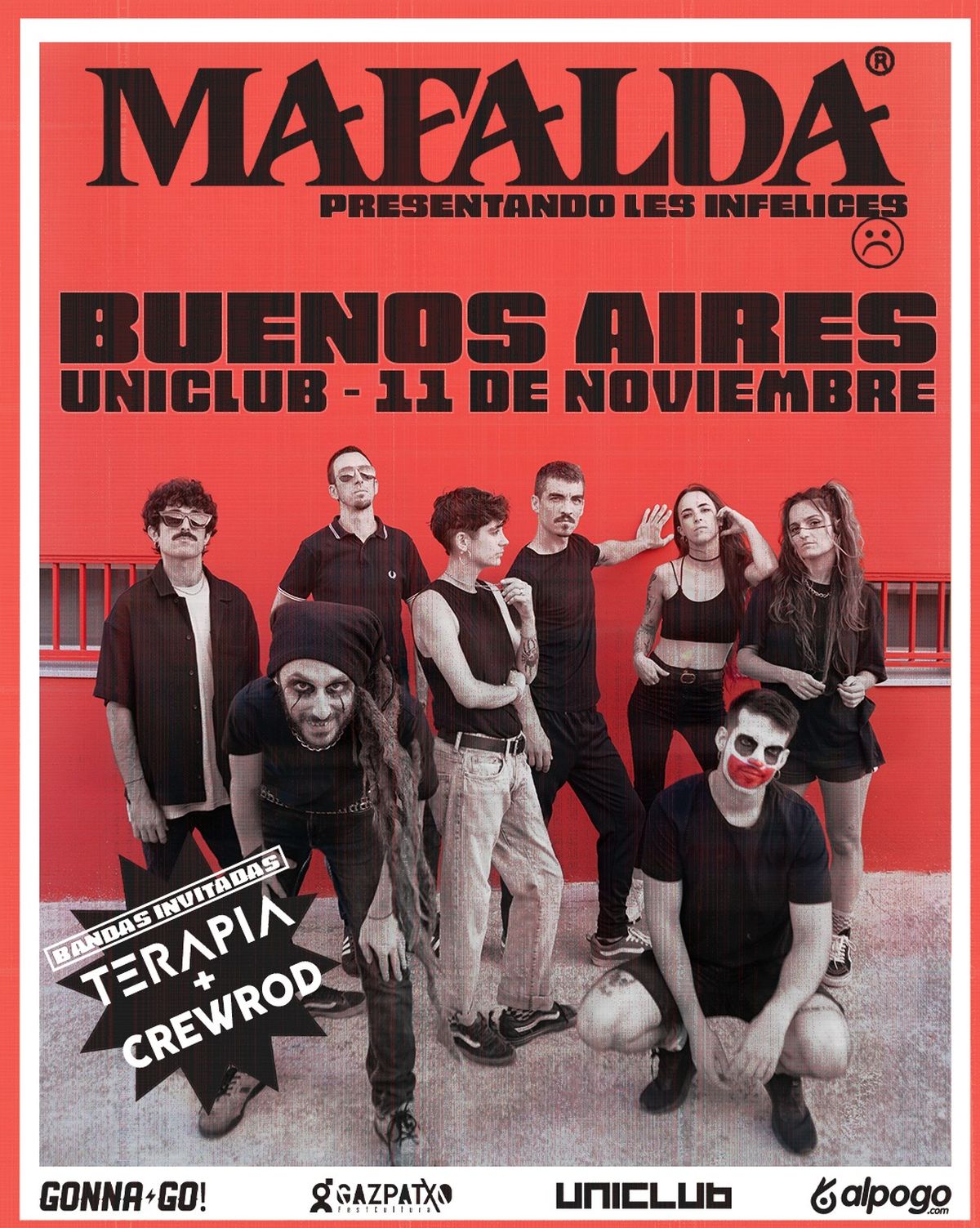La banda de Valencia surgida en 2010, Mafalda, llega a la Argentina con un show el día 11 de noviembre a las 20 horas en Uniclub (Guardia Vieja 3360), junto a dos grupos invitados: Terapia y Crewrod.