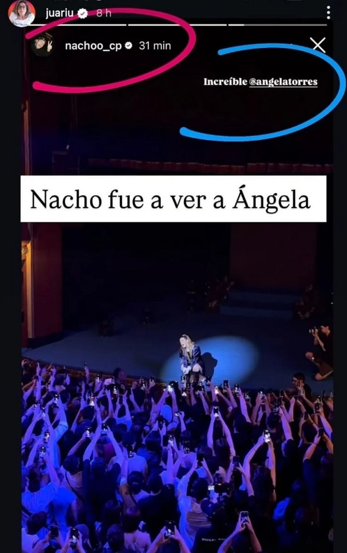 "Nacho fue a ver a Ángela", lanzó la especialista en redes en sus historias de Instagram mostrando la imagen de él en el recital de la artista en el Teatro Margarita Xirgu.