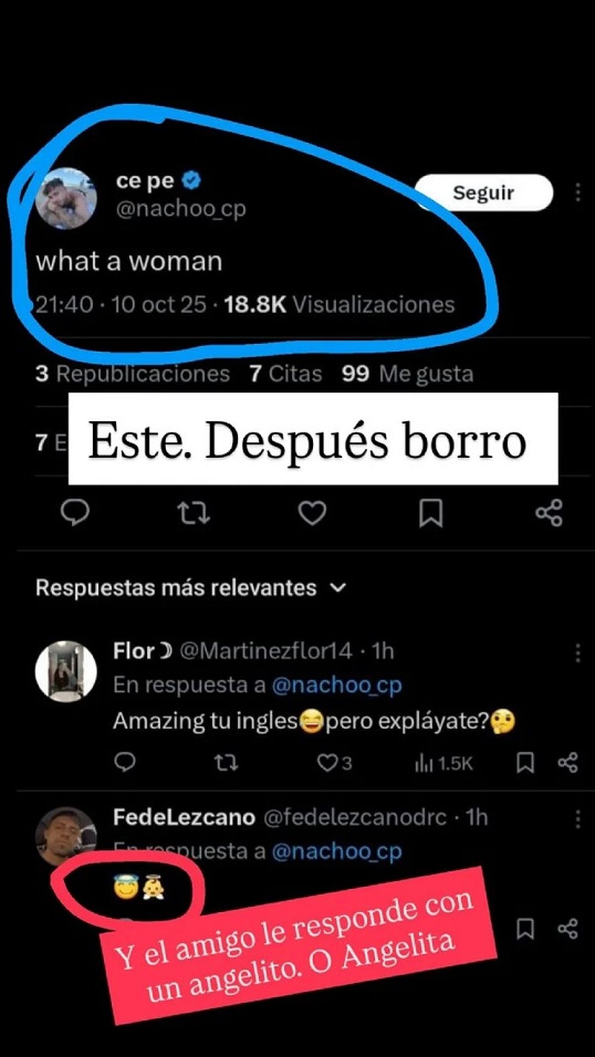 "Ellos se likean", agregó la panelista. Y luego dio otro indicio más que despertó más dudas sobre el vínculo entre los dos: "'What a woman' (qué mujer)",fue el mensaje que remarcó Juariu de Nacho en la red social X a la hora en que observaba el show de Ángela Torres.