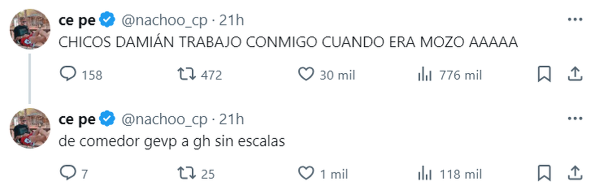 Atónito por verlo entrar a la casa más famosa del país, Nacho recurrió a su cuenta de X, donde tiene más de 200 mil seguidores y escribió: "Chicos Damián trabajó conmigo cuando era mozo".