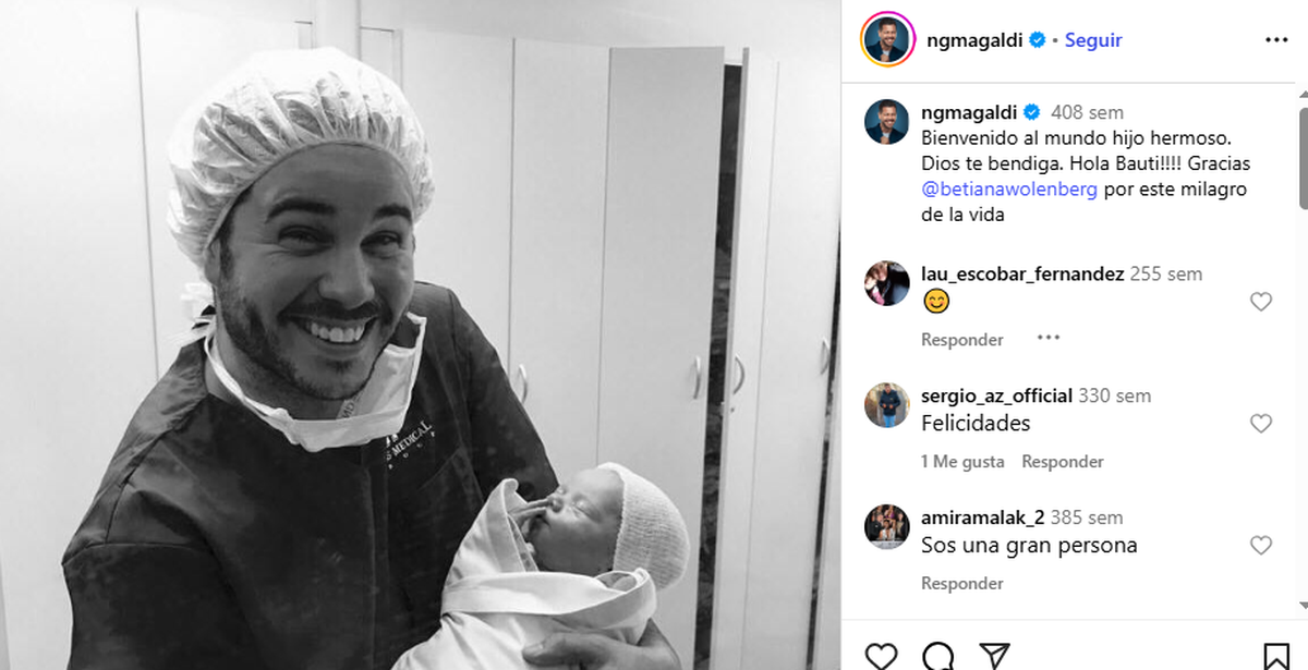 "Bienvenido al mundo, hijo hermoso. Dios te bendiga. ¡Hola, Bauti! Gracias @betianawolenberg por este milagro de la vida", expresó el conductor en Instagram tras la llegada del pequeño.