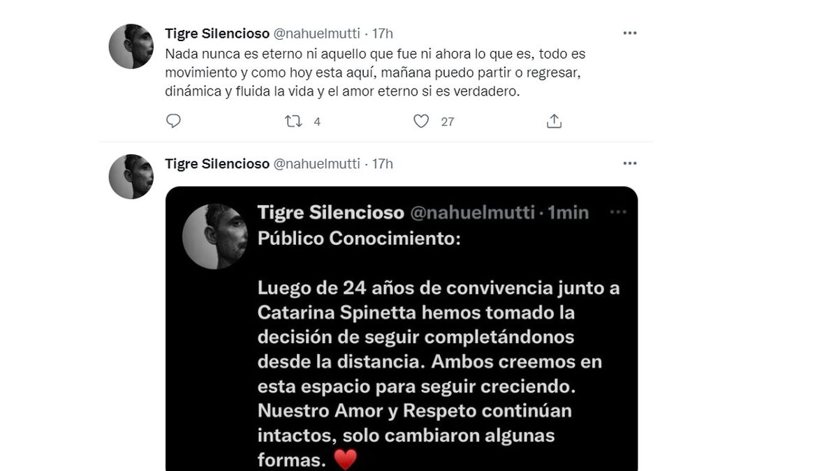 “Público conocimiento. Luego de 24 años de convivencia con Catarina Spinetta hemos tomado la decisión de seguir completándonos desde la distancia. Ambos creemos en este espacio para seguir creciendo. Nuestro amor y respeto continúan intactos, solo cambiaron algunas formas”, indicó el ex Verano del 98.
