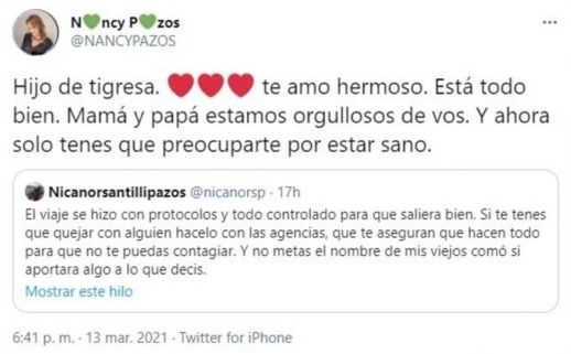 “En el medio subieron a un avión, comieron en el avión, es decir que se sacaron el barbijo porque el vuelo dura 7 horas. Fueron al baño. En fin. Seguro que es porque yo soy mal pensada. Porque si dan positivo allá tienen que dejar al chico aislado, seguir pagando su estadía, cambiar el ticket aéreo y el seguro contempla pagar el pasaje de un padre para que vaya a acompañarlo", explicó Nancy.