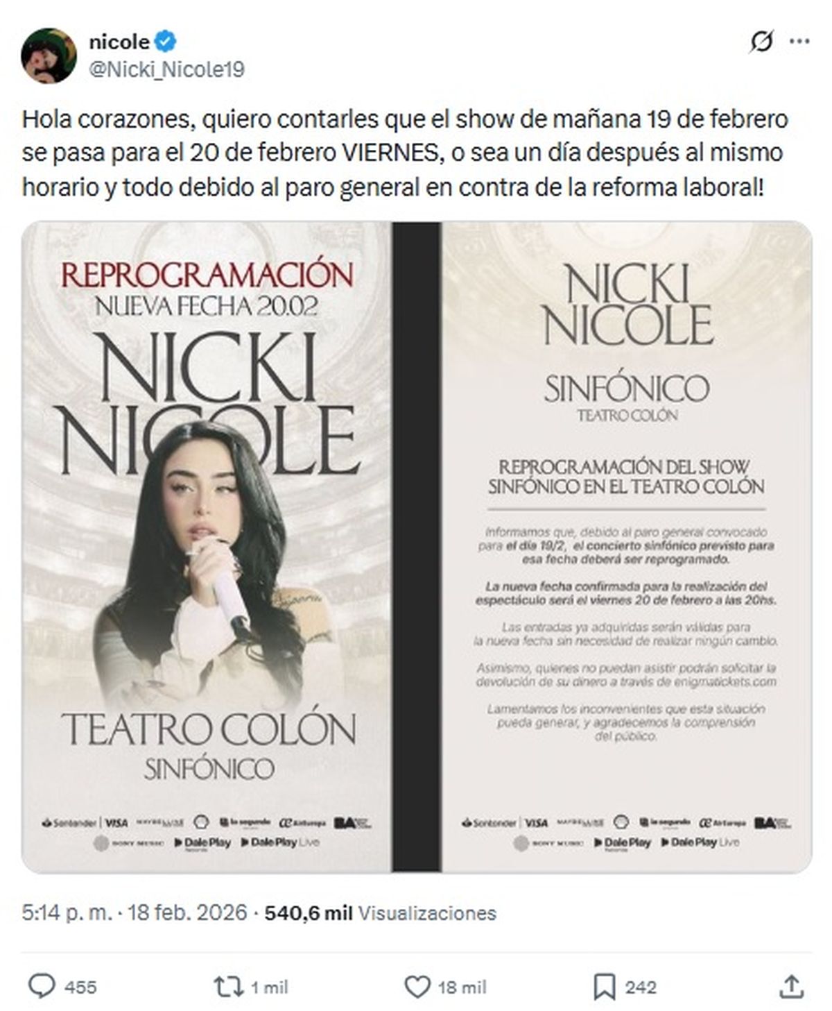 En un primer mensaje dirigido a sus seguidores, expresó: "Hola corazones, quiero contarles que el show de mañana 19 de febrero se pasa para el 20 de febrero VIERNES, o sea un día después al mismo horario y todo debido al paro general en contra de la reforma laboral!".