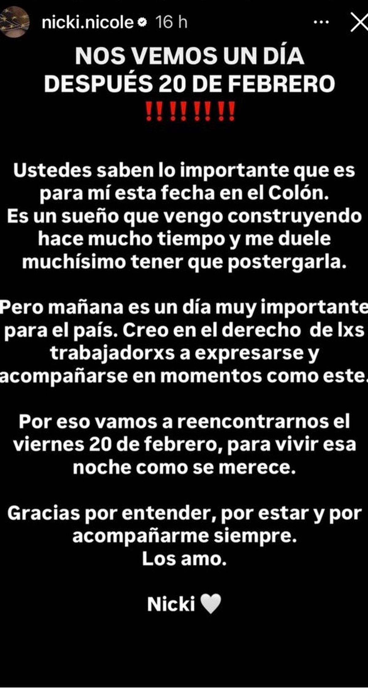 Lejos de cerrar el tema ahí, la artista volvió a pronunciarse para agradecer el acompañamiento de su público: "Por eso vamos a reencontrarnos el viernes 20 de febrero, para vivir esa noche como se merece. Gracias por entender, por estar y por acompañarme siempre. Los amo".