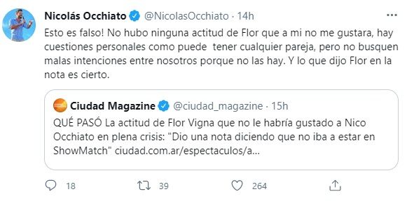 En este marco, en la noche del viernes Occhiato lanzó un mensaje vía Twitter aclarando la situación ante una nota que salió publicada: "Esto es falso! No hubo ninguna actitud de Flor que a mi no me gustara, hay cuestiones personales como puede tener cualquier pareja, pero no busquen malas intenciones entre nosotros porque no las hay. Y lo que dijo Flor en la nota es cierto".
