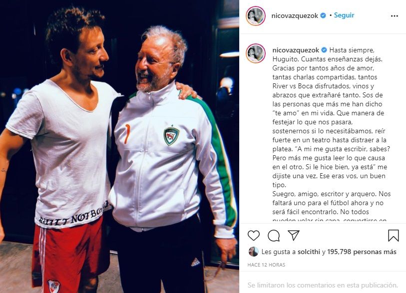 El actor le dedicó un sentido posteo a su querido suegro: "Hasta siempre, Huguito. Cuantas enseñanzas dejás. Gracias por tantos años de amor, tantas charlas compartidas, tantos River vs Boca disfrutados, vinos y abrazos que extrañaré tanto. Sos de las personas que más me han dicho “te amo” en mi vida".
