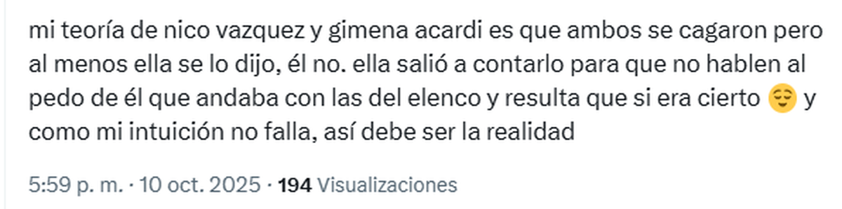 "Mi teoría de Nico Vázquez y Gimena Accardi es que ambos se cagaron pero al menos ella se lo dijo, él no. Ella salió a contarlo para que no hablen al pedo de él que andaba con las del elenco y resulta que si era cierto", opinó otro usuario en la red social.