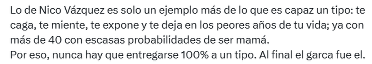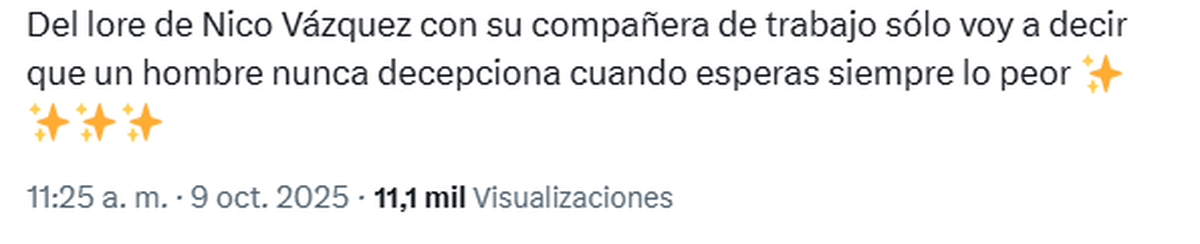 “Lo de Nico Vázquez es solo un ejemplo más de lo que es capaz un tipo: te caga, te miente, te expone y te deja en los peores años de tu vida”, fue uno de los comentarios. Mientras que otra persona agregó: “Del lore de Nico Vázquez con su compañera de trabajo sólo voy a decir que un hombre nunca decepciona cuando esperas siempre lo peor”.