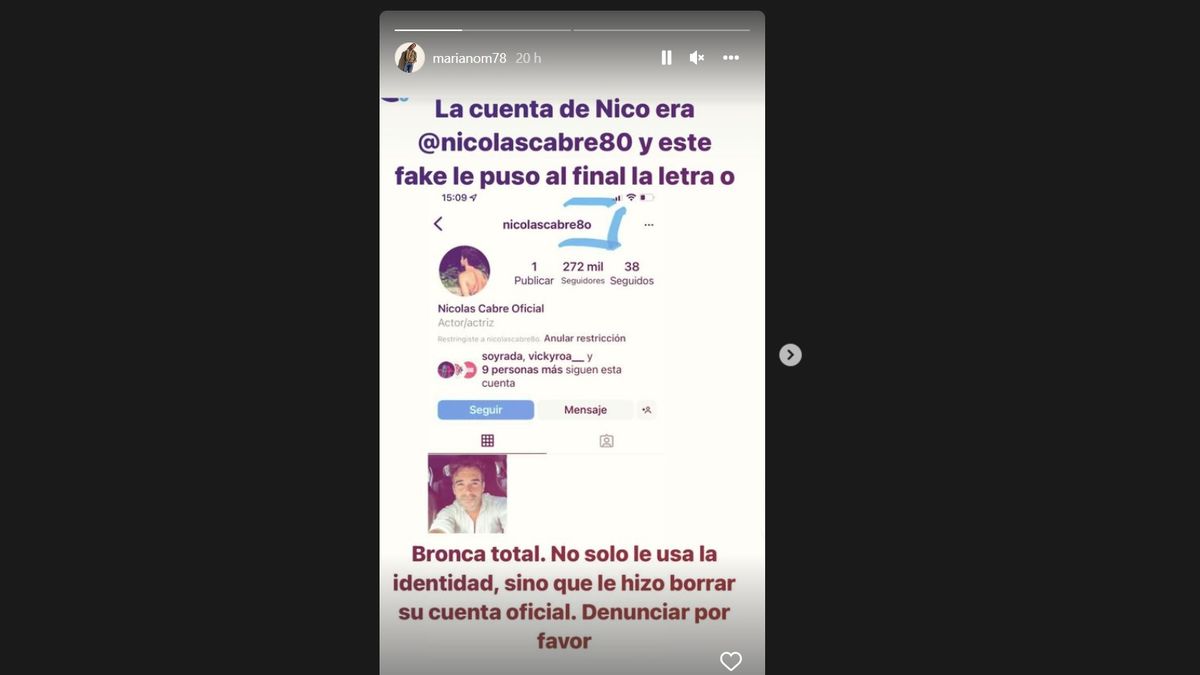 Por su parte, Mariano Martínez aportó desde sus historias: “La cuenta de Nico era @nicolascabre80 y este fake al final le puso la letra O. Bronca total, no solo le usa la identidad, sino que le hizo cerrar su cuenta oficial. Denunciar por favor”.
