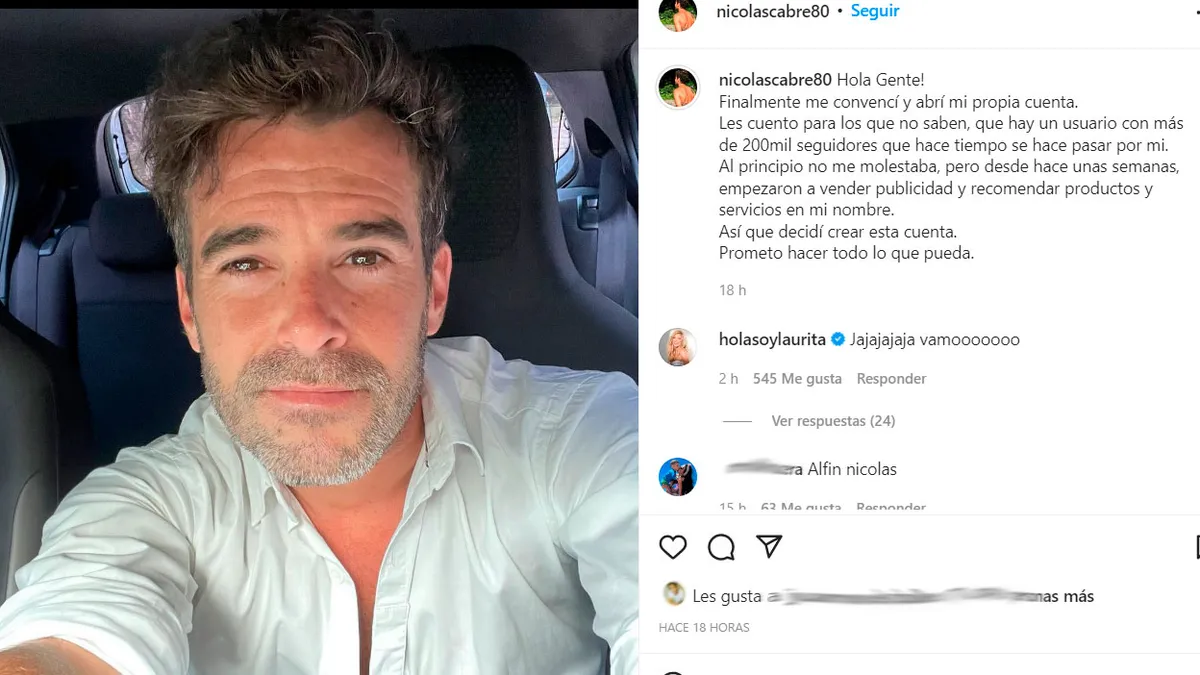Mercedes Funes, amiga del actor, compartió un video para advertir lo que ocurría: “Les quiero contar, para que nos ayuden también ustedes replicando, algo sobre la cuenta de Instagram de Nico Cabré. Por fin ayer abrió su cuenta de Instagram, porque tenía otra cuenta que no era de él...mejor dicho, había alguien que se hacía pasar por él, que tenía 270 mil seguidores".