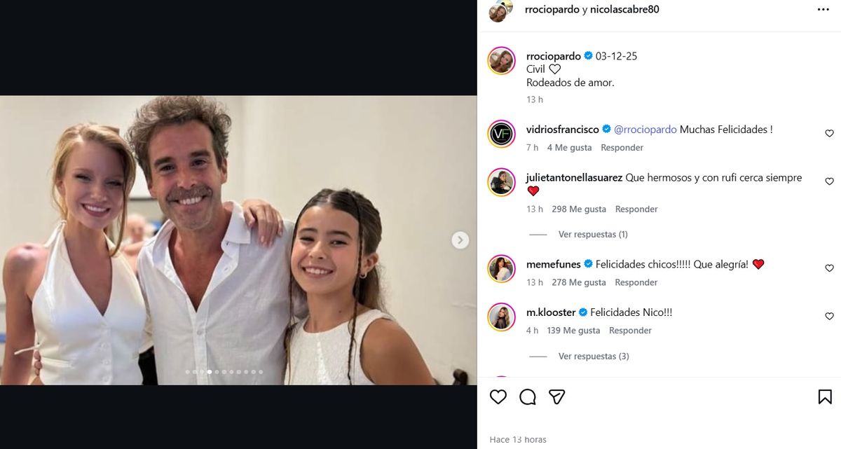 "3-12-2025. Civil. Rodeados de amor", fue el texto escrito por la actriz en la publicación donde se pueden ver imágenes del instante en el que la jueza de paz los declara marido y mujer, así como también el saludo de los novios frente a su círculo íntimo en medio de una lluvia de papelitos.
