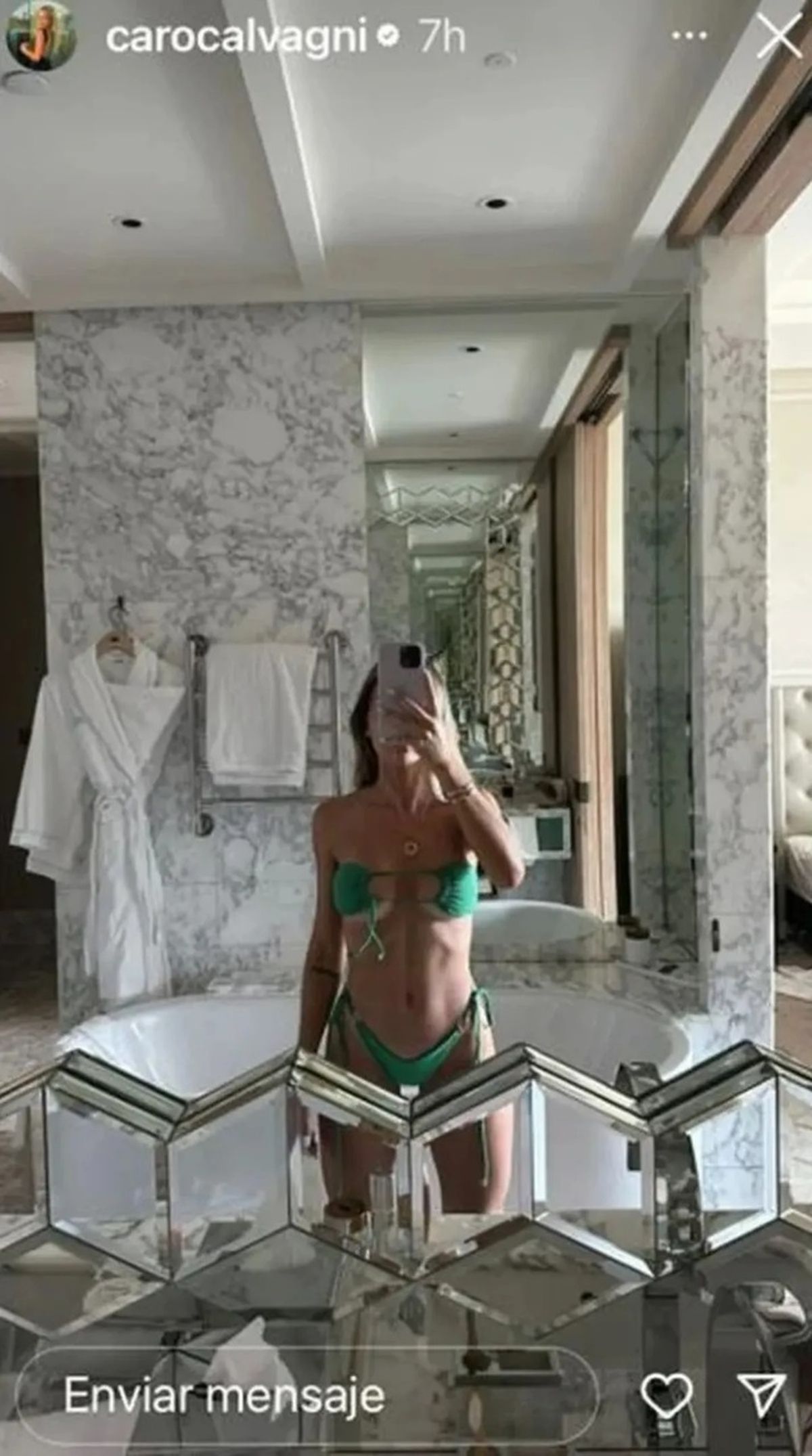 Caro Calvalgni se sacó una selfie en el espejo con una microbikini verde con escote underboob, que se caracteriza por tener el corpiño al revés, sin breteles, y por la parte de abajo, una cintura altísima.