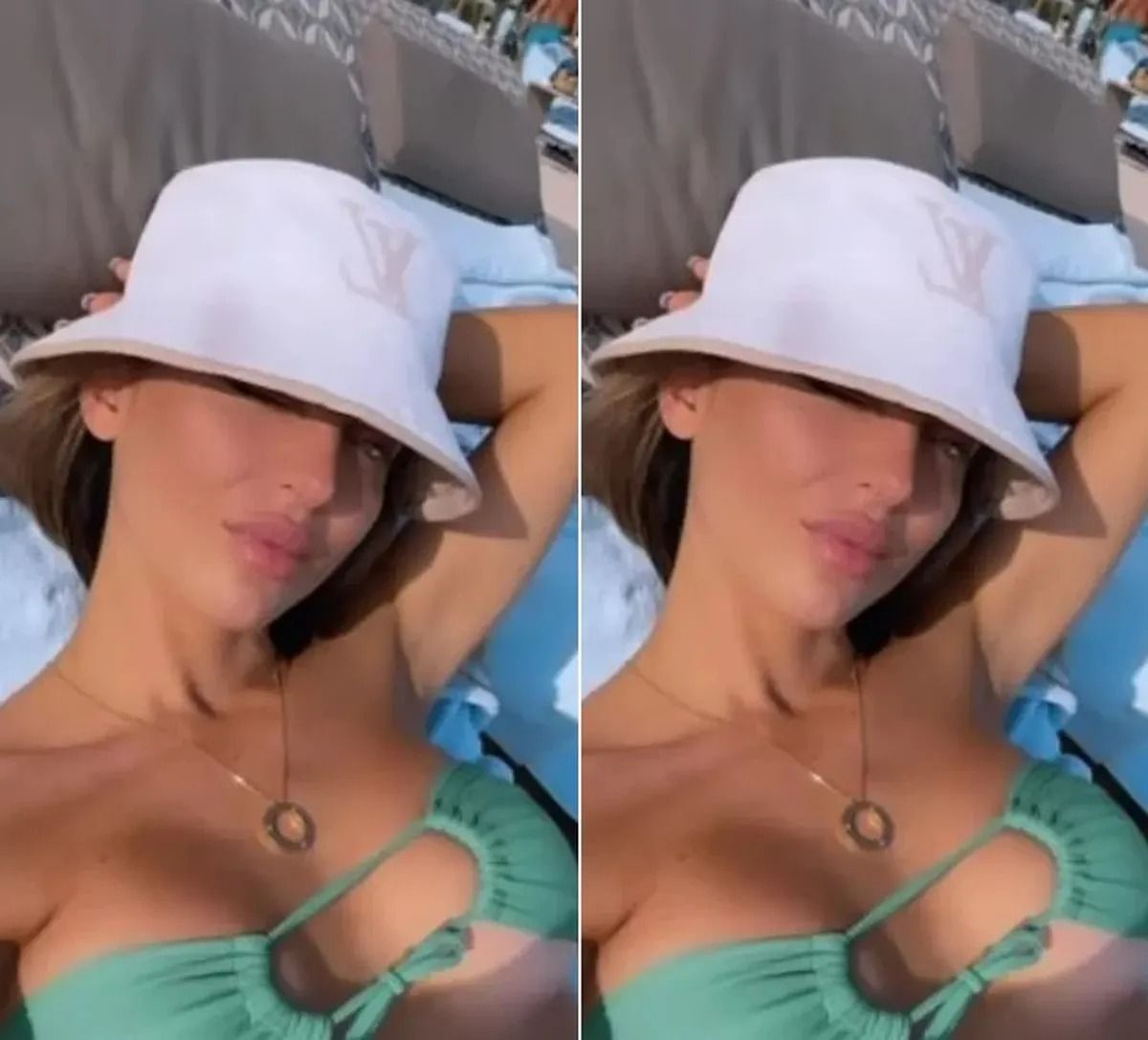 La esposa del futbolista, que entrena mucho y suele compartir sus rutinas en las redes, lució con microbikini color verde y un piloso, mientras disfrutaba del calor del lugar.